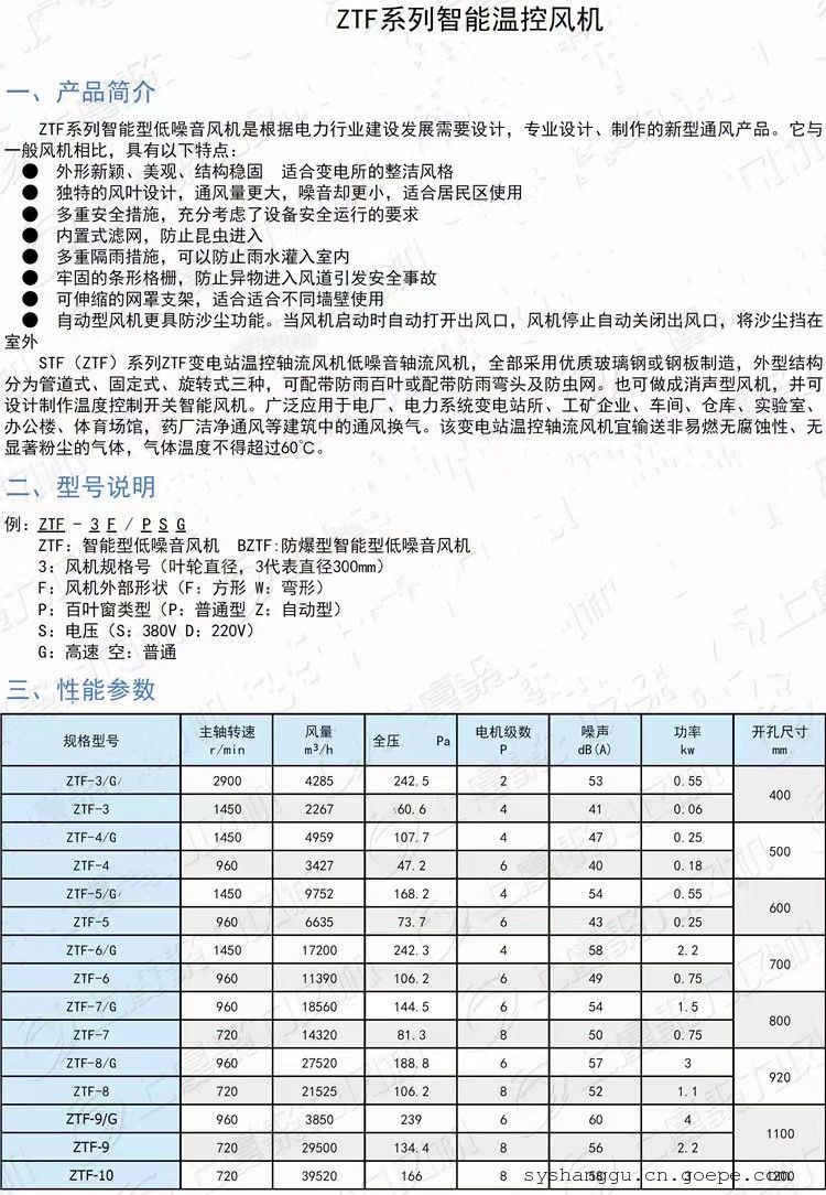加工定制:是 品牌:上鼓 型号:STF-5/0.55KW 输入功率:550 w 风量:9752 m3/h 适用范围:配电房 重量:30 ㎏ ZTF系列风机优势